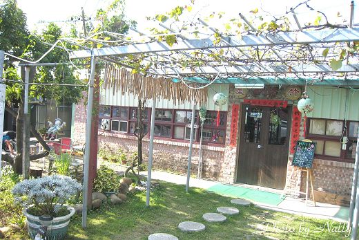 外頭上聯、左右聯,加上紅磚裝飾而成,外頭還有絲瓜棚架...很古式感!